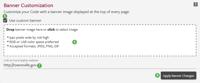 This feature allows you to update the colors used on your eCode360 site, creating a visual experience that matches your own website. The following colors can be modified:- Banner Background: This includes the color along the top of the code page as well as the Home page