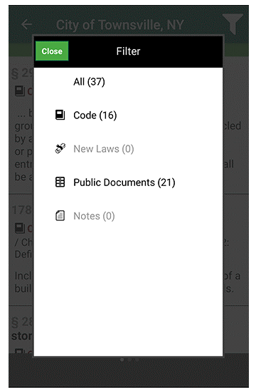 - Filter: View results by content type. Results will be categorized as either Code content, New Laws, Public Documents such as Minutes or Agendas, or Notes added to a Code.