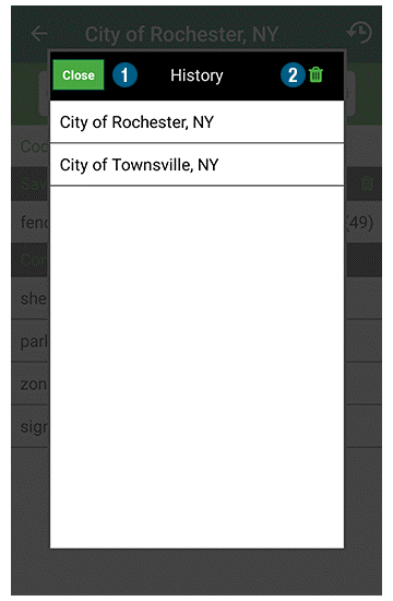 The History screen shows the Codes you have previously accessed in the app. Tap an entry in the list to open the Search screen for the selected Code.- Close button: Tap to close the history screen.
